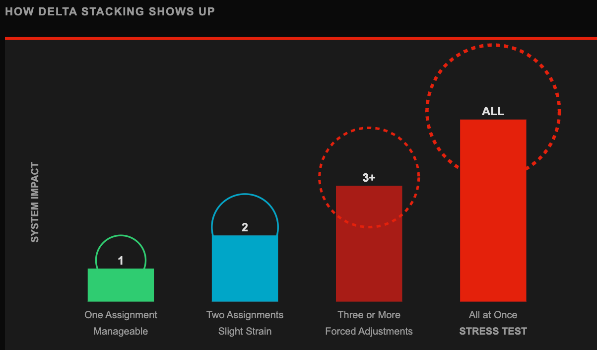ScenarioResultOne assignmentManageableTwo assignmentsSlight strainThree or moreForced adjustmentsAll at onceStrategy stress test