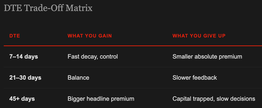 This is why many disciplined Wheel traders operate inside 7–21 DTE.